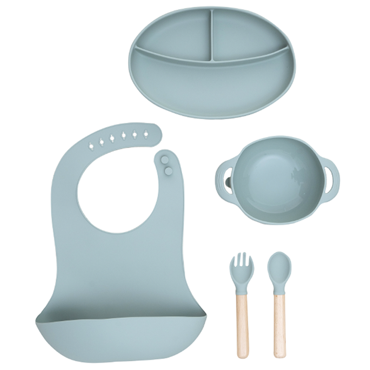 - Babero de Silicona: Ajustable y fácil de limpiar, el babero cuenta con un práctico recogemigas para mantener la ropa de tu bebé limpia durante las comidas.